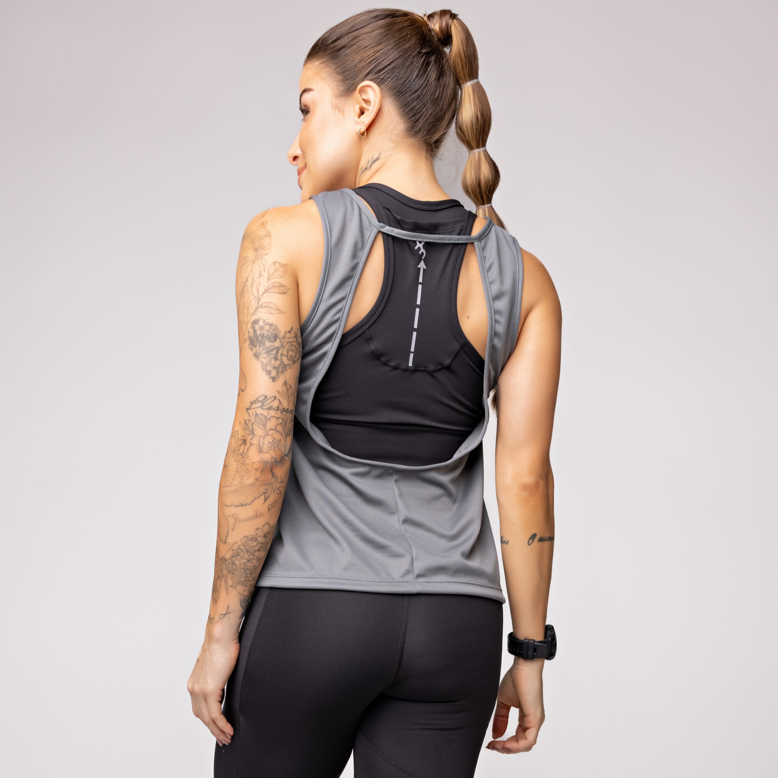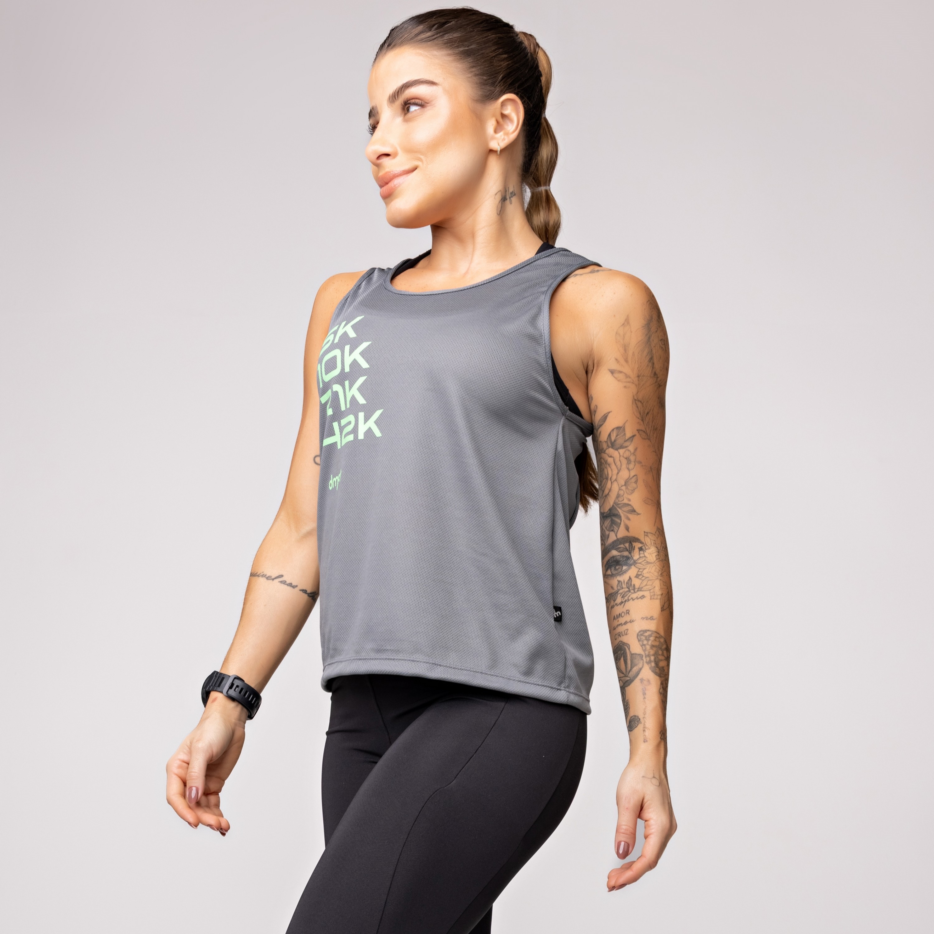 • Regata Dry Furadinho Preta com Detalhe nas Costas e Estampa Km