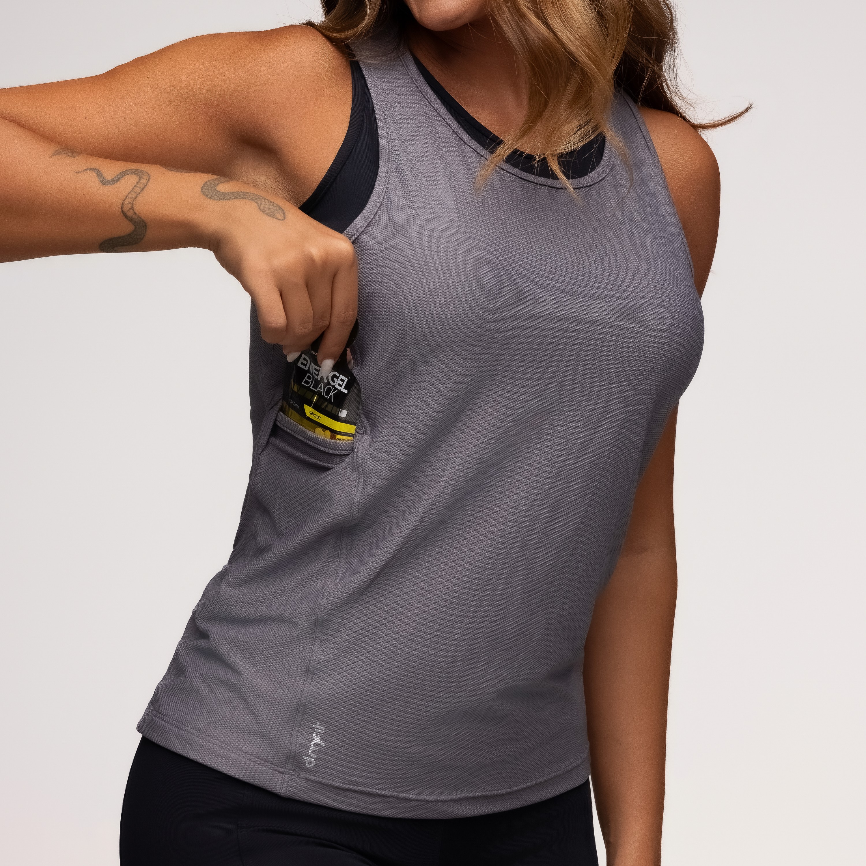 • Regata Dry Furadinho Cinza com Detalhe e Estampa Corredora